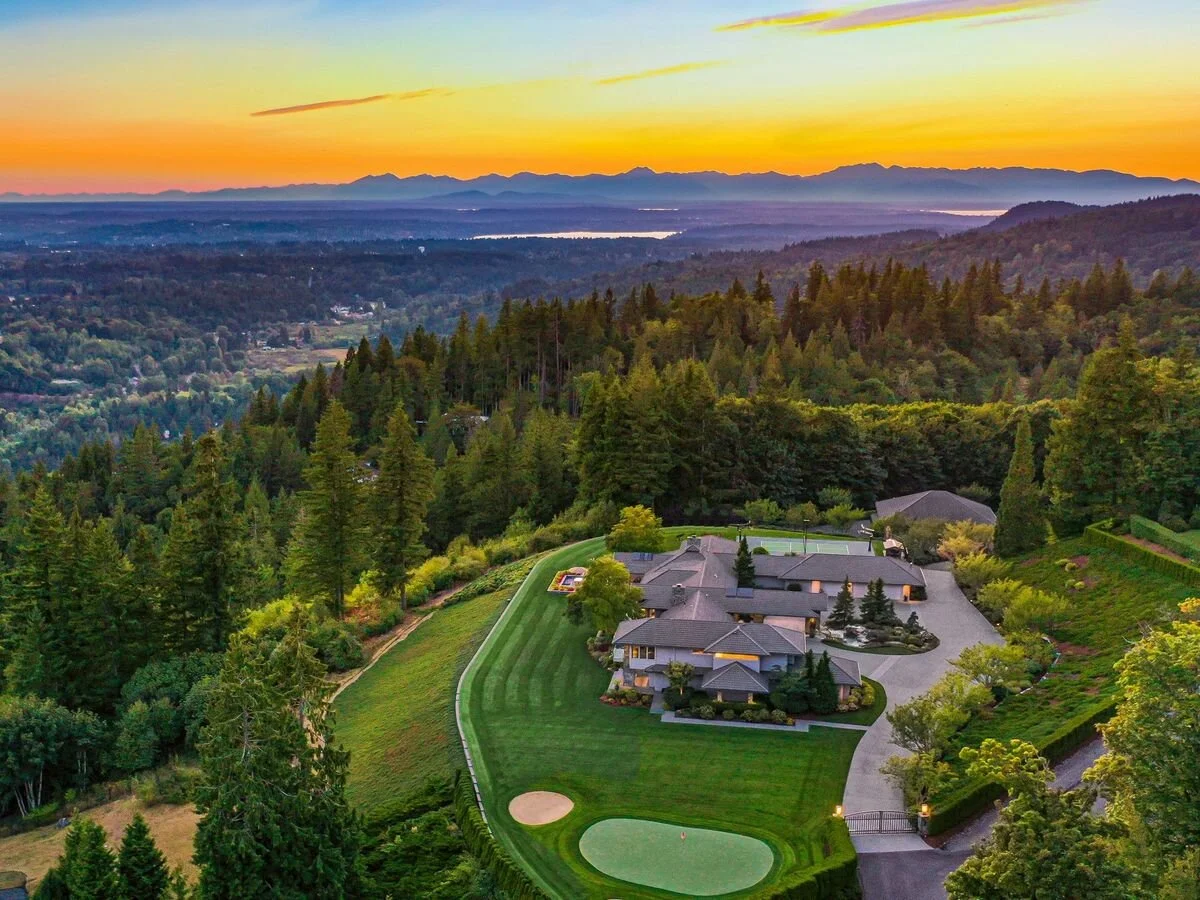 11435 206th Pl SE is a profound example of the results that are possible when clients, architect and builder work hand-in-hand to create a timeless masterpiece that pays tribute to a spectacular location. Carefully sited on 10 acres at the top of Cougar Mountain, this stunning Ralph Anderson-designed estate offers over 11,000 square feet of meticulously crafted and sumptuously detailed interior space that frames one-of-a-kind, 270-degree views that sweep from Mt. Rainier over Puget Sound, Seattle, Lake Washington and Bellevue, all the way to the Olympic Mountains and North Cascades beyond. Eagles soar above and local wildlife enjoys its native habitat while airplanes and weather fronts pass in the distance far below.