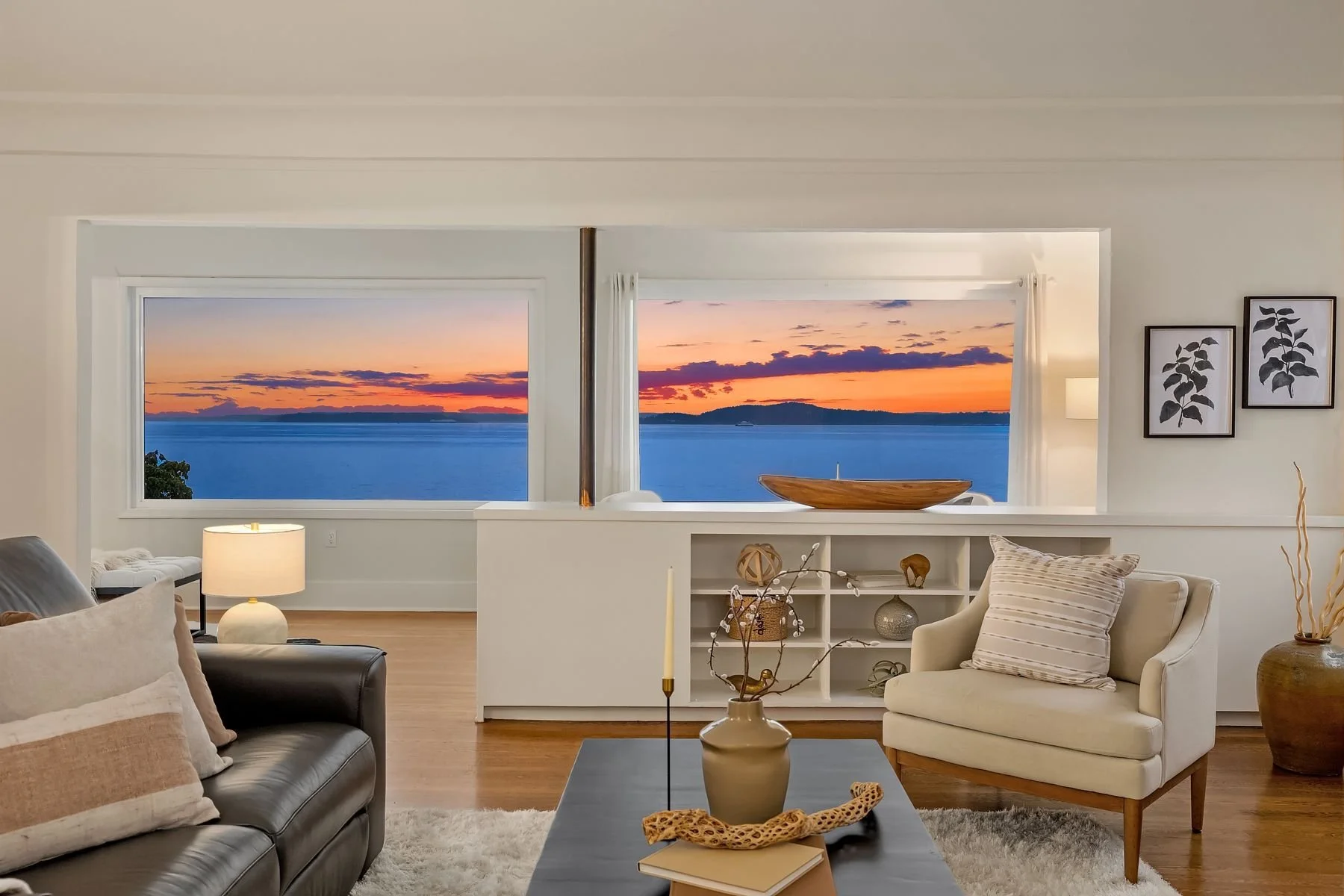 This private beachfront sanctuary boasts 78 feet of waterfront and breathtaking southwestern views of Puget Sound, Mount Rainier, and the Olympic Mountains. Relish in the beauty of every sunrise, sunset, and the vibrant maritime activity and wildlife from every level of this stunning home. The light-filled, open floor plan seamlessly connects the spacious dining, living, kitchen, and sunroom areas—ideal for entertaining. The upstairs primary suite, complete with a private patio, offers a serene owner’s retreat. Lush, mature landscaping frames the winding stairs to the bulkhead and beach below. Minutes to downtown Seattle, this home uniquely blends the best of Pacific Northwest nature with urban convenience.